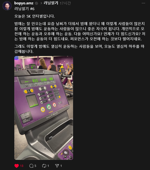 최근 5km 러닝에서 기록에 욕심내는 것을 조금 내려놓고 인터벌로 바꾸기도 하고, 변화를 주면서 달려보고 있습니다. 날이 더워서이기도 하고, 한 가지에 너무 익숙해지지 않으려고 하는 마음도 있어서인데요. 러닝은 러닝대로, 인터벌은 인터벌대로 느끼는 게 또 다르더라고요.