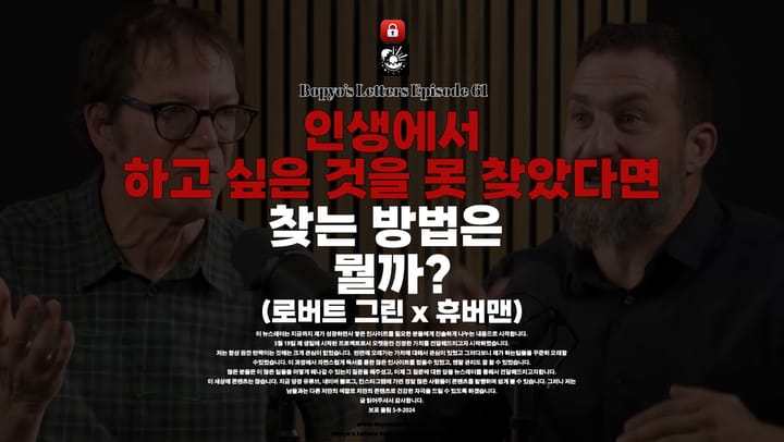 만약 이런 감정을 느끼셨다면, 오늘 소개할 영상이 도움이 될 것이라 믿습니다. 휴버먼 팟캐스트에 출연한 베스트셀러 작가 로버트 그린(『전쟁의 기술』, 『유혹의 기술』 저자)과의 대화인데, 이 영상을 통해 여러분이 잃어버린 길을 찾는 데 작은 단서를 얻을 수 있을지도 모릅니다.