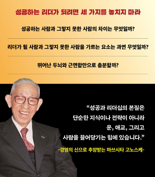 이러한 저의 생각에 거대한 확신을 더해준 책이 있습니다. 바로 일본 경영의 신, 마쓰시타 고노스케의 ‘리더의 길을 묻다’입니다. 이 책은 화려한 경영 전략이나 기술을 말하지 않습니다. 대신, 리더가 가져야 할 근본적인 마음가짐과 철학에 대해 이야기합니다.