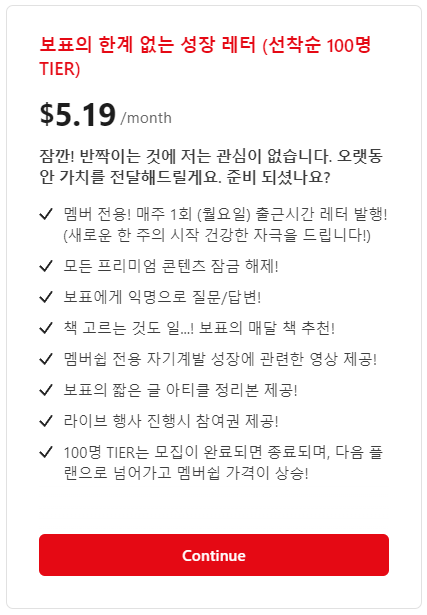 - 100명 TIER는 모집이 완료되면 종료되며, 다음 플랜으로 넘어가고 멤버쉽 가격이 상승!