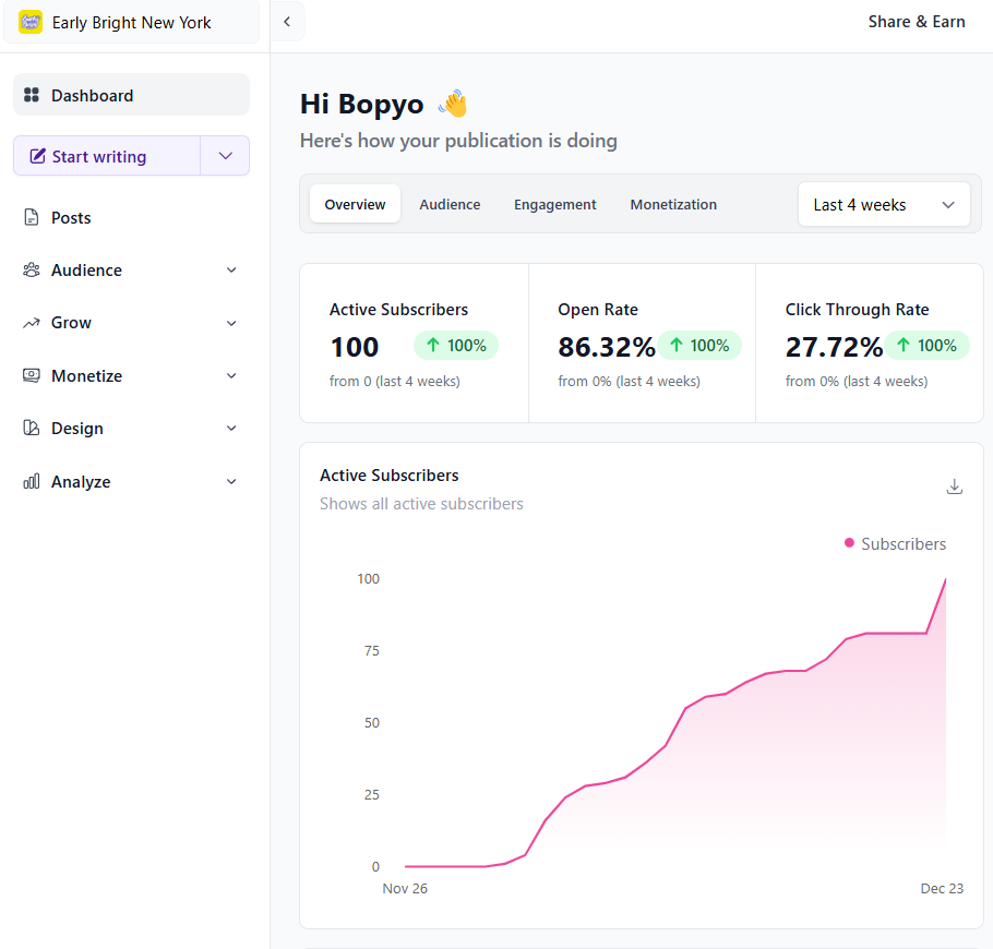 결국 브랜드 뉴스레터를 통해 구독자 100명을 달성했습니다. 이 구독자들 중에는 제가 아는 분들도 있지만, 미국 고객들도 포함되어 있습니다. 처음 시작할 때는 100명을 모을 수 있으리라고는 생각하지 못했지만, 23일 만에 이 목표를 달성할 수 있었습니다.