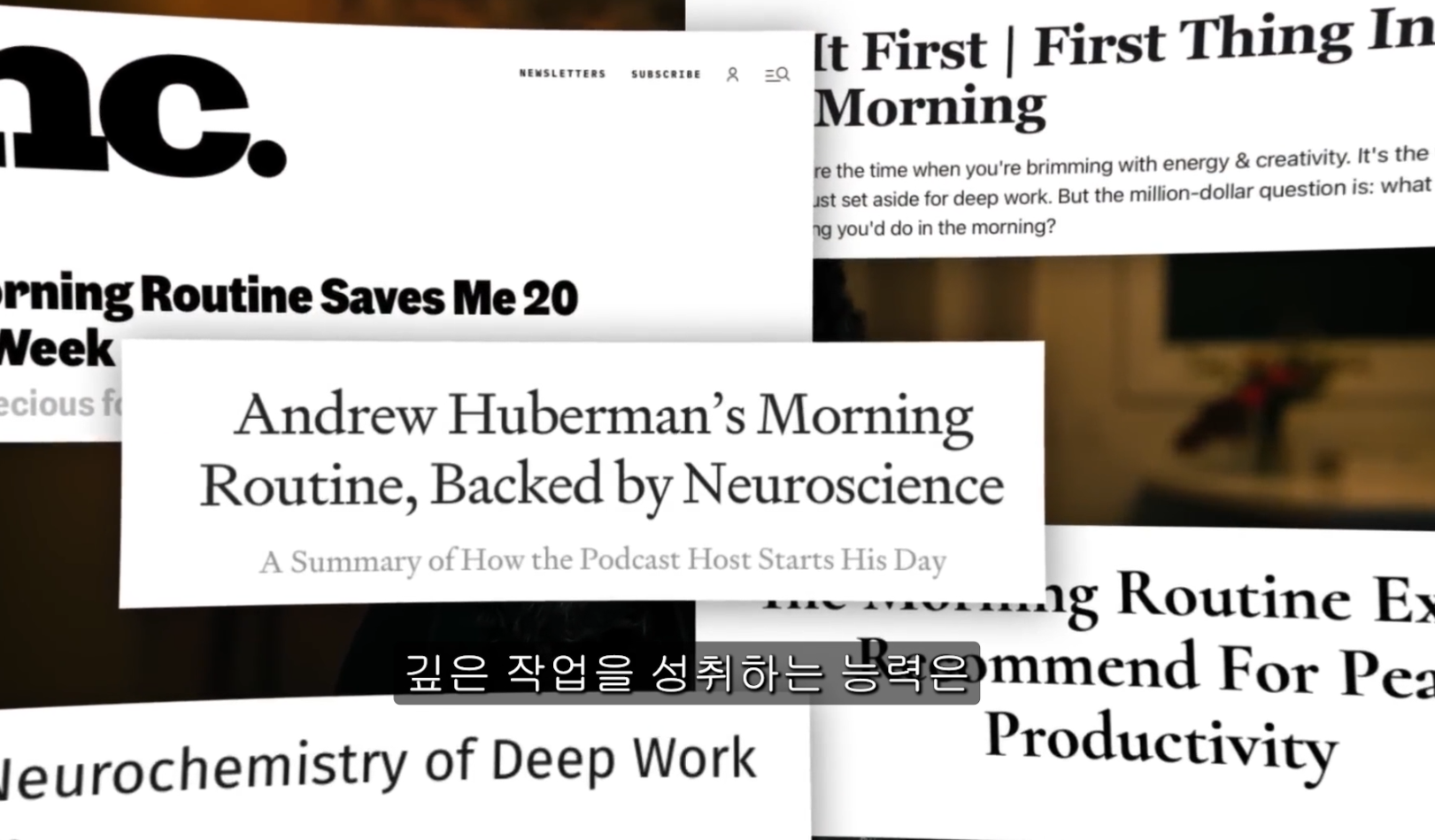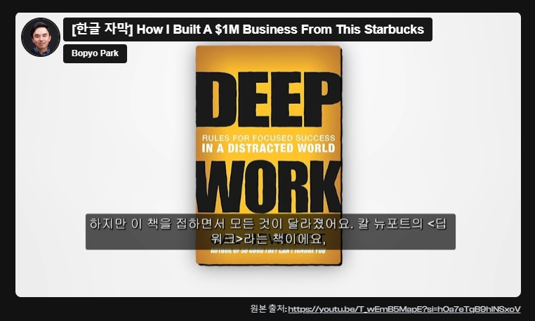영상에서 그는 아침에 일어나자마자 일할것을 권장했지만 어떤 사람의 경우 밤에 더 집중이 잘 되는 분들도 있을것입니다. 우리가 알아야 할 포인트는 내가 가장 집중할 수 있는 시간이 언제인지 파악한 후에 즉, 아침에 일어나서 해본것과 오후에 집중하는 것, 잠들기 전에 집중하는 것 비교를 해서 나만의 최적의 몰입 시간을 찾아서 그 시간만큼은 일에 집중하라는 것입니다. (핸드폰, 넷플릭스 이런 것 멀리하고 말이죠)