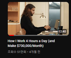그는 How I Work 4 Hours a Day (and Make $730,000/Month) 라는 제목으로 유튜브에 영상을 올리고 51만뷰와 1,800개가 넘는 코멘트를 받으며 많은 사람들에게 영향을 줬습니다. 적게 일하고 더 많이 벌고 싶어하는 사람들에게 말이죠.