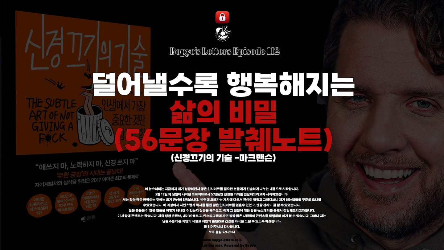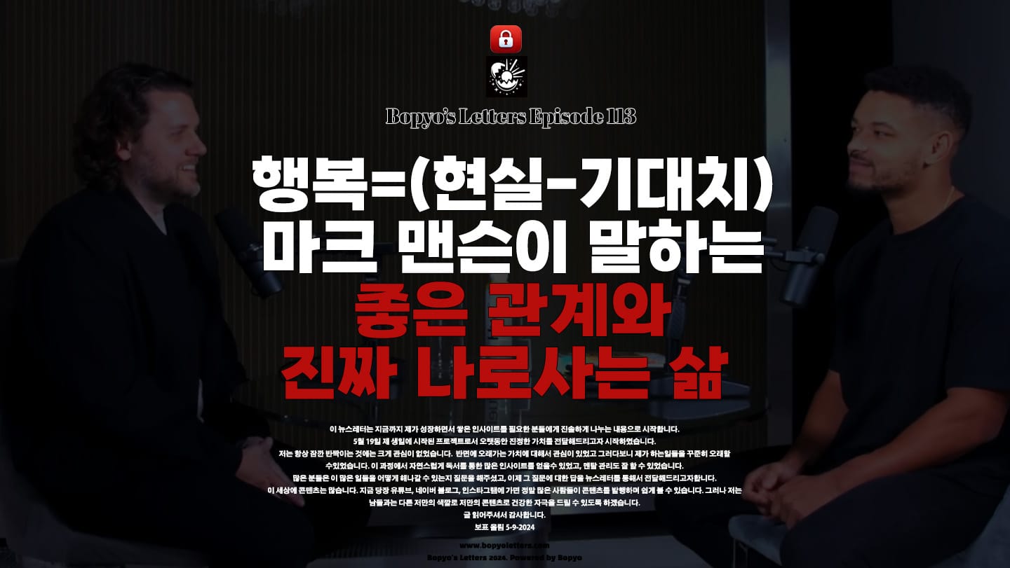 이번 주 보표레터에서 마크 맨슨에 대해서 다루고 있는데 이번 팟캐스트도 보표레터를 유료 구독하셨다면 한국어 풀버전을 보실 수 있으니 가장 하단 부분에서 시청하시길 추천드리며, 시간이 없으신 분들은 제가 청취하면서 감명 깊은 부분들을 아래에 정리해두었으니 먼저 보실것을 추천드립니다.