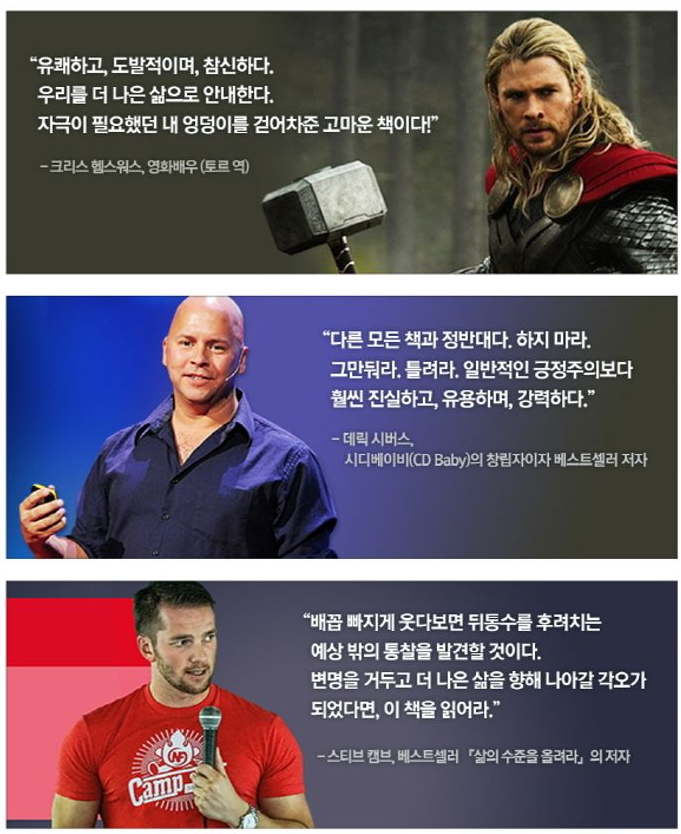- 운동을 즐기는 사람은 멋진 몸을 갖고 워커홀릭은 초고속 승진을 하며 고된 연습을 견딘 아티스트는 무대 위에서 빛을 발한다. 당신이 선택한 고통이 당신을 만든다.