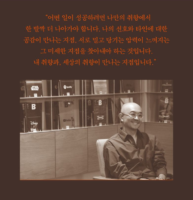 - 어떤 일이 성공하려면 나만의 취향에서 한 발짝 더 나아가야 합니다. 나의 선호와 타인에 대한 공감이 만나는 지점, 서로 밀고 당기는 압력이 느껴지는 그 미세한 지점을 찾아내야 하는 것입니다. 내 취향과 세상의 취향이 만나는 지점입니다.