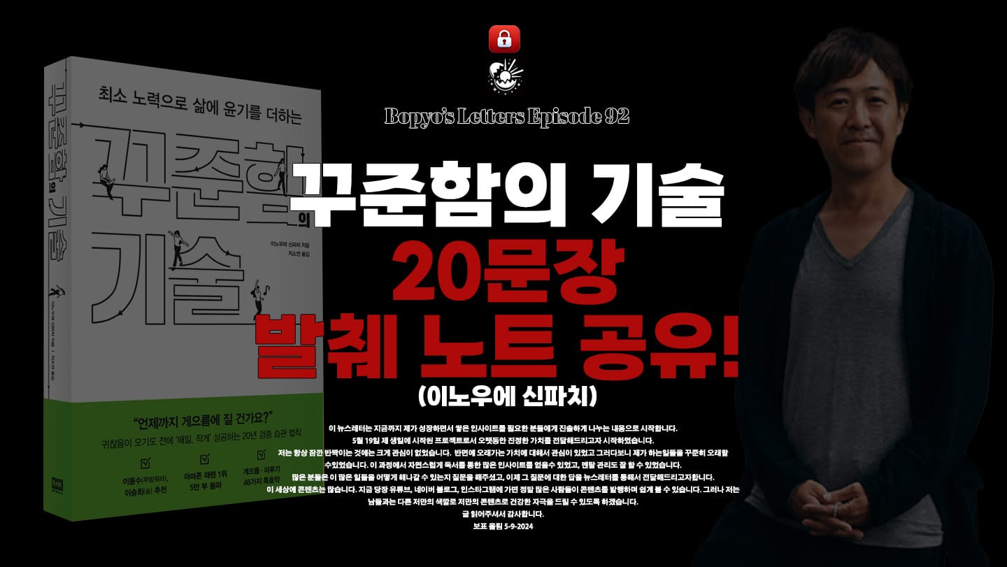 만약 꾸준히 하는 무언가가 있는데 아직 성과가 나지 않았거나, 혹은 꾸준하게 하는 노하우가 궁금하신 분들이 계시다면 오늘 보표레터가 도움이 될 거라 생각합니다. 독서 인사이트와 영상 인사이트 모두 꾸준함 특집으로 준비했기 때문입니다.