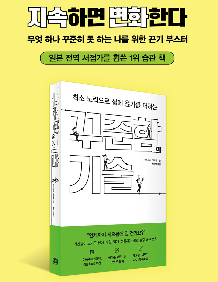 개인적으로 일본 작가들의 책이나 영화를 좋아했습니다. 학생 시절, '러브레터' 같은 영화나 일본 특유의 무미건조한 영화들을 즐겨 보곤 했습니다. 화려한 할리우드 영화와는 다른 매력으로 다가왔기 때문입니다. 그리고 일본 문학도 종종 읽었습니다. 그래서 그런지 저는 성인이 되어서도 일본인들의 책을 종종 읽습니다. '꾸준함의 기술'은 이노우에 신이치가 쓴 책으로, 무언가를 꾸준히 하려면 어떻게 해야 하는지에 대해 저자의 경험을 깊이 있게 다루는 책입니다.
