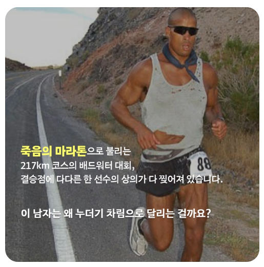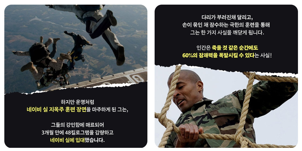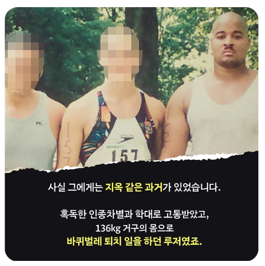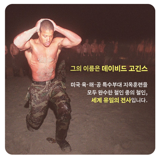 그의 이름은 데이비드 고긴스입니다. '누구도 나를 파괴할 수 없다'라는 책으로 국내에는 잘 알려져있는 신체적, 정신적 한계를 극복하고 미국 특수부대 지옥훈련을 모두 완수했으며 17시간 동안 턱걸이 4030회를 달성했으며 2007년에는 지구상에서 가장 힘들다는 배드워터 울트라 마라톤 대회에 출전 3일간 달려야하는 죽음의 레이스에 참여 결국 3위에 입상하여 상금을 탑니다.