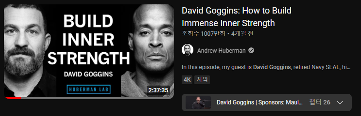 얼마전 무려 1007만뷰를 기록한 그가 출연한 Andrew Hubeman의 팟캐스트를 봤습니다. 무려 2시간 37분동안 그가 삶을 대하는 태도 그리고 어떻게 성공할 수 있었는지, 그리고 내면의 우리를 어떻게 깨워야하는지 이런 심도있는 내용들을 이야기해주며 정말 많은것을 느끼게 해주었습니다.